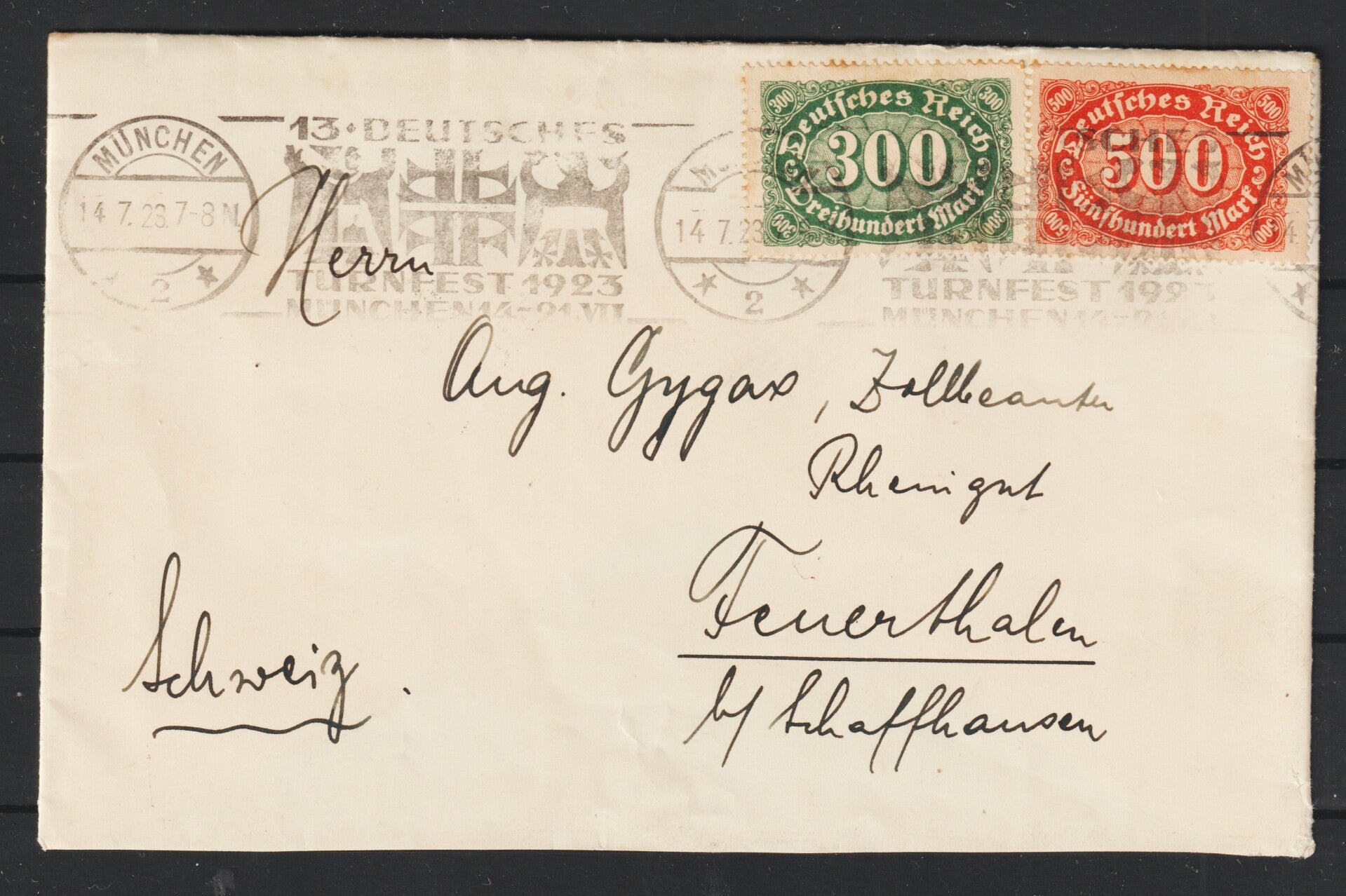 MiNr. 221, 223 auf portogerechten Brief MÜNCHEN 14.7.23 und Werbestempel “13. DEUTSCHES TURNFEST 1932” in die Schweiz