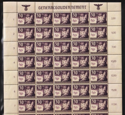 Generalgouvernement MiNr. 76 kompletter Bogen postfrisch mit Plattenfehler I: Summenzähler 74 statt 64