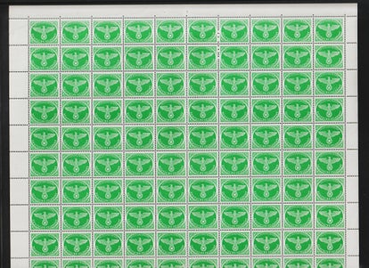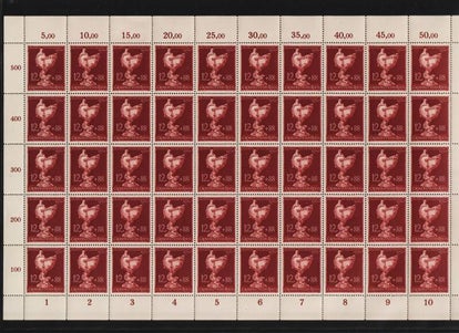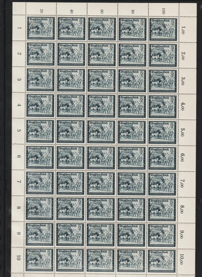 MiNr. D 143 postfrischer Bogen, 50 Pfennig Hakenkreuz mit Wasserzeichen, Oberrand nicht durchgezähnt (ndgz) Michelwert: 1000,00 € sehr seltener Bogen