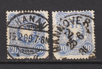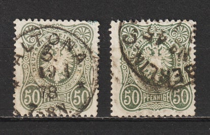 2x MiNr. 41 gestempelt Plattenfehler III (Feld 99/100): “Wertziffer und Pfennig dick”, Katalogpreis: 20,00 €