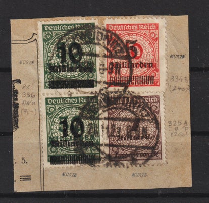 MiNr. 330 HT, PE1 sowie 2 weitere 330 in Mischfrankatur mit 328, 329 auf Wertbrief über 38 Billionen Mark vom 30.11.23