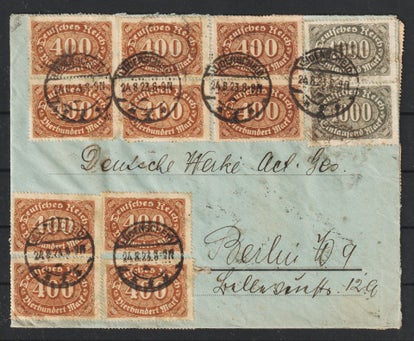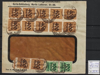 Dezember Brief (13x 325, 3x 338) von Rendsburg 3.12.23 nach Berlin in der Portoperiode 27, Porto betrug 100 Milliarden oder 10 Pfennig (10 Milliarden = 1 Pfennig) Der Brief ist mit 0,03 Pf überfrankiert, seltener Beleg in sehr guter Erhaltung