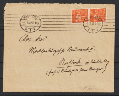 MiNr. 333 portogterechte Einzelfrankatur auf Orts-Brief Hamburg vom 17.11.23, Katalogpreis: 750,00 €