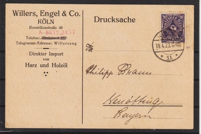 MiNr. 314 Mehrfrankatur auf portogerechter Postkarte, von Carl Kittler, Landwirtschtl. Maschinen Cölleda vom 20.10.23 dem Ersttag der Porpoperiode 21, an die Firma Rudi Lack in Leipzig Plugwitz