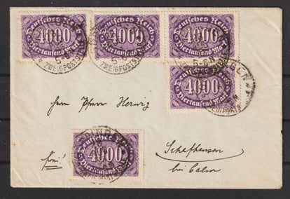 MiNr. 321 B auf portogerechten Brief mit 6x HT ! und 3x PE 5, vom 5.11.23, Ersttag der Portoperiode 23, Katalogpreis: 460,00 €