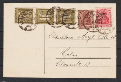 Postkarte von Köln nach Böhmen/Tschechei, mit 25 Doplatit nachfrankiert am 23.8.20, Die beiden Marken DR MiNr. 101 mit Firmenlochung VA