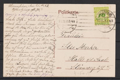 MiNr. 328 portogerechte Einzelfrankatur auf Postkarte von Naumburg nach Chemmnitz am 25.11.23, Letzttag der Portoperiode 25