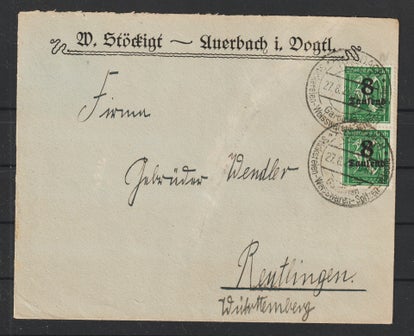MiNr. 324 (2x) auf portogerechten Brief vom 7.11.23, Portoperiode 23, vom Sporthaus BERNER & Steinmetz in Würtzburg nach Reicholzheim