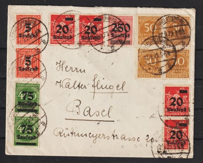 Portogerechter Dezember Brief (1x 328, 3x 338, 2x 339, 1x 340) von Dresden 23.12.23 nach Mollis / Schweiz in der Portoperiode 27, Porto betrug 300 Milliarden oder 30 Pfennig (10 Milliarden = 1 Pfennig)