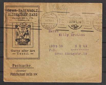 Dt. Reich Brief 1923 Postscheckamt Berlin mit Werbung "Gebr. Barenholz Nordhausen Harz, Garne aller Art, Textilien