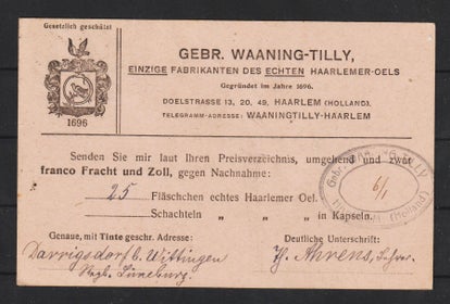 Postkarte mit privaten Zudruck der Gebr, Waaning-Tilly, Einzige Fabrikanten des Echten Haarlemer Oels, gesetzlich geschützt seit 1696