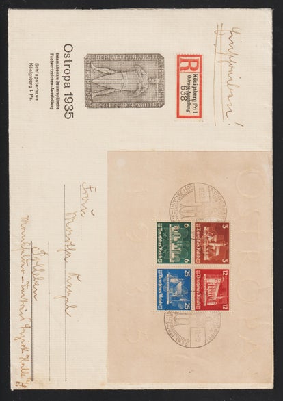 SA/SS 1945 mit Zusatzfrankatur, tadellos auf Einschreibebrief von "BERLIN C 43 21.4.45.". "Marken und Stempel sind echt, eine Beförderung auf dem Postweg kann ich nicht bestätigen." Diese Briefe wurden nach heutigen Erkenntnissen erst nach dem II. Weltkrieg gefertigt und eine Prüfung findet nicht mehr statt. Fotoattest Hans-Georg Schlegel BPP.