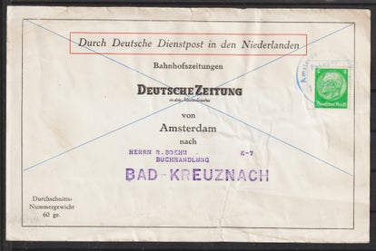 Durch Deutsche Dienstpost in den Niederlanden, Bahnpost, Bahnhofszeitungen, Deutsche Zeitung in den Niederlanden, Stempel "Amsterdam -Bentheim Bahnpost 11.MRT 1941"