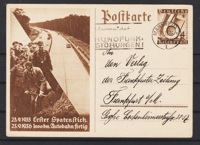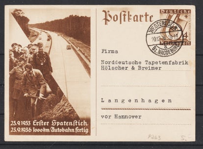 Ganzsache Karte P 263, Propaganda Karte: Hitler macht den ersten Spatenstich zum Autobahnbau am 23.9.1933, am 23.9.1936 1000 km fertig gestellt