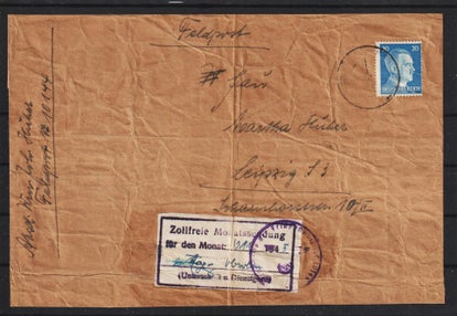 Feldpost, Zollfreie Monatsendung, Aufklebezettel und 20 Pf. Freigebühr auf vollständiger Päckchenadresse/Absender, selten