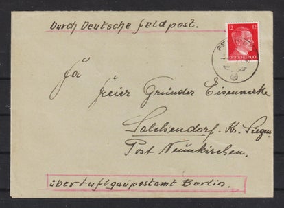 Roter Kastenstempel: “Durch die deutsche FELDPOST” MiNr. 827 mit Feldpoststempel entwertet am 18.4.43