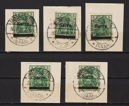 5 mal Saar MiNr. 4 Briefstücke mit Vollstempel